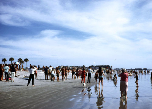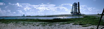 On the morning of Apollo 15's launch, my family and I were on the beach at Cocoa Beach, right where the 520 causeway ends at the beach past highway A1A. On that morning we heard the first few seconds of the liftoff broadcast over the radio. Liftoff was at 9:34 a.m. on July 26, 1971. A few moments later looking north towards the Kennedy space center some 12-15 miles away we saw this very very bright wedge of light way off in the distance. Everyone on the beach stood up and looked towards the rocket and began cheering.
