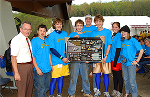 The races were divided into 2 - friday was the high schools and saturday included the universities. A high school award given to the most unique buggy. Lafayette County C-1 High School team two, Higginsville, Mo., won this award. Pictured right are the winners with a framed copy of my poster.
